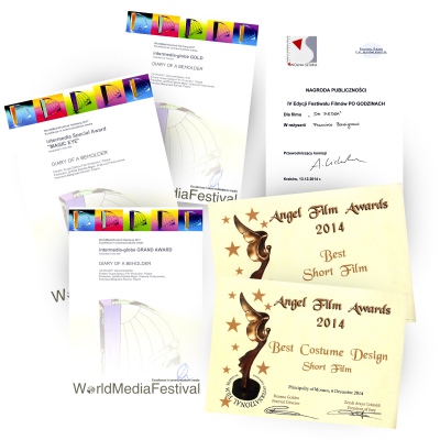 Second place in Bangalore Film festival 2014, Best Short Film and Best Costume at Monaco Film Festival 2014, First Place and the Audience Award at PO GODZINACH Film Festival 2014, Award Soul of Impulse at Utah Film Festival 2015, Platynum Award at INSENMA Film Festival 2015, Award at INDIE SHORT Film Festival 2015, Best Make-up Award at Short in Fest 2016, Special Award from the Jury in BULVA Flm Festival 2017, Mention for the photography in ART POVERARTE Film Festival 2017, First Award in Category Free at the TRACCE CINEMATOGRAFICHE Film Festival 2017...